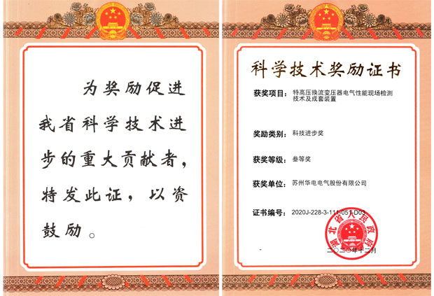苏州华电参与的科技项目《特高压换流变压器电气性能现场检测技术及成套装置》荣获2020年度湖北省人民政府科技进步三等奖。